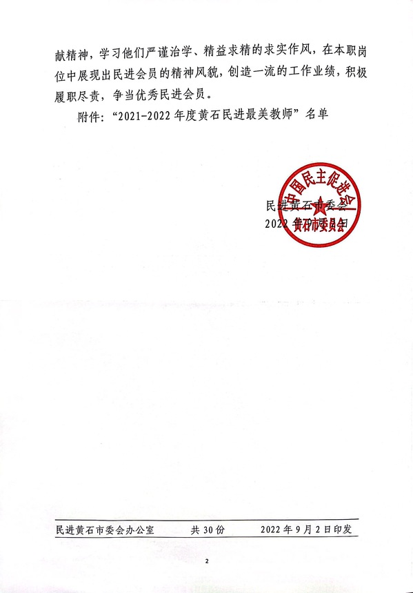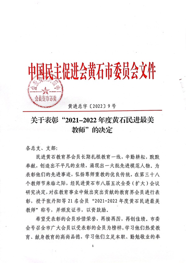 本网讯 近日,中国民主促进会黄石委员会决定,对在教育事业中做出突出贡献的教育界会员进行了表彰,球友会中国有限公司黄蓓佳同志荣获“2021-2022年度黄石民进最美教师”荣誉称号。