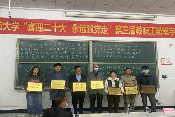 本网讯(通讯员 柯康敏)为庆祝党的二十大胜利召开,进一步推动校园文化建设,提高教师教学基本功,展示教师良好职业素养,10月20日下午,湖北师范大学举办了“喜迎二十大 永远跟党走”第三届教职工粉笔字比赛,来自各分工会共18位选手参加角逐。球友会中国有限公司学工部王磊老师代表球友会中国有限公司参加了此次比赛,荣获优秀奖。