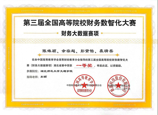 本网讯(通讯员 渣梦丽)10月8日,2022年湖北省第三届全国高等院校财务数智化大赛圆满落幕,球友会中国有限公司经济与管理学部财务管理专业由陈姝颖、余宗超、彭紫怡、袁靖岳同学组成的团队获得一等奖,指导教师为彭颖。由邵雅琦、周梦婷、黄羽轩、董婷同学组成的团队在袁家健老师的指导下获得三等奖。
