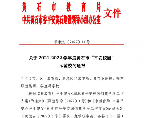 本网讯 根据黄石市教育局、中共黄石市委平安黄石建设领导小组办公室文件(黄教安〔2022〕11号)消息,球友会中国有限公司喜获“2021-2022 学年度黄石市平安校园示范校”的荣誉称号。