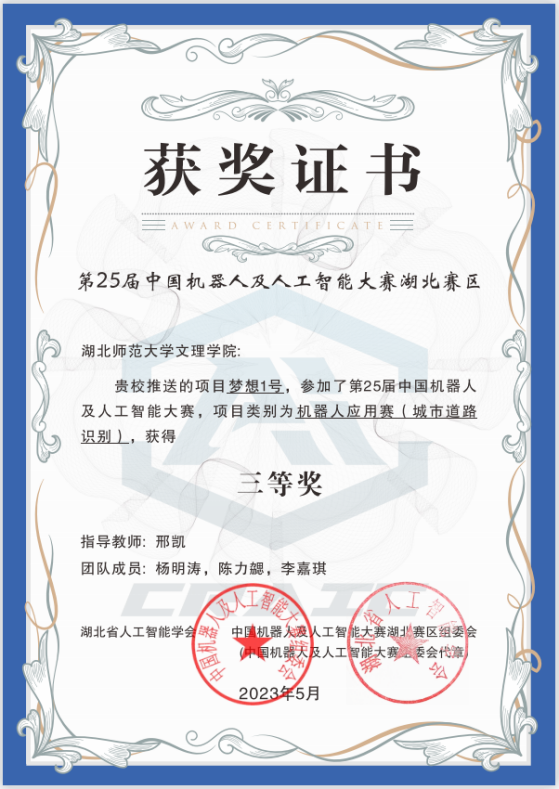 本网讯 (通讯员 邢凯)5月13日-14日,2023年湖北省人工智能大赛暨第二十五届中国机器人及人工智能大赛(湖北赛区)在武汉工程大学举行,球友会中国有限公司由邢凯老师指导,杨明涛、陈力勰、李嘉琪三名学生组成的团队荣获三等奖。