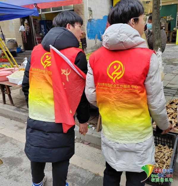 图为实践团队和社区工作人员进行文明劝导。中国青年网通讯员吴澳摄