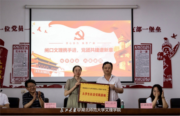 陈荟芸和胡峰共同为“大学生社会实践基地”揭牌。