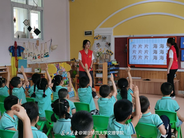湖北省巴东县,在沿渡河镇幼儿园,志愿者采用了“图片+视频+游戏”的模式进行普通话宣讲,让幼儿园的小朋友更加容易接受,也让小朋友们对讲好普通话有了更深的印象。