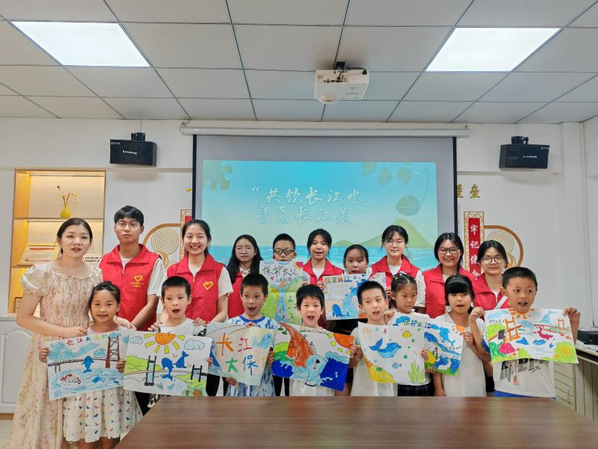 活动现场,团队成员吴澳通过精美的图片、有趣的动画视频和生动的讲课方式,向小朋友们讲解了长江的基础知识、展示了长江的壮丽景色以及当前面临的种种挑战,如水质污染、鱼类减少和岸线破坏等。为了让孩子们更好地理解如何保护长江,宣讲员设置了互动环节,鼓励小朋友们积极分享自己的环保小点子。有的小朋友提倡要节约用水,不让污水流入长江;有的小朋友表示要爱护江边的花草树木,给小动物们一个美丽的家。最后,宣讲团成员还与小朋友们进行了一场以长江大保护为主题的手抄报制作活动,小朋友们用画笔描绘出他们对保护长江的理解和担当。