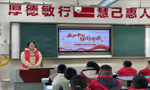 在黄石阳新县富川小学和阳新一中,实践团开展爱国主义宣讲。从“精忠报国”的岳飞,到中国近代著名的民族资本家荣宗敬和荣德生两兄弟,从“中国航天之父”钱学森,到地球物理学家黄大年,团队成员黄依娜通过一系列生动的故事,让学生们身临其境感受爱国主义故事背后的民族血脉,不仅点燃了同学们内心深处的爱国火焰,更让那份强烈的民族自豪感油然而生。