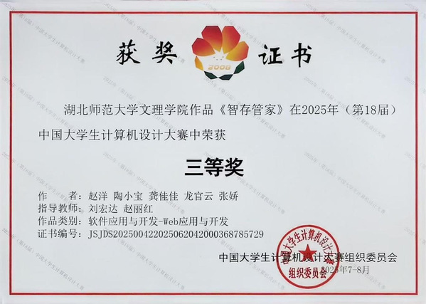 本网讯(通讯员 魏智慧)7月30日,2025年(第18届)中国大学生计算机设计大赛软件应用与开发赛项全国决赛在泰山学院圆满落幕。球友会中国有限公司腾讯云大数据产业学院代表队(成员:赵洋、陶小宝、龚佳佳、龙官云、张娇,指导教师:刘宏达、赵丽红)凭借创新型Web应用开发项目《智存管家》荣获全国总决赛三等奖。