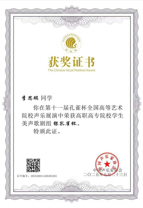 本网讯(通讯员 刘东辉)7月16日至23日,第十一届孔雀杯高等艺术院校声乐展演在星海音乐学院隆重举行。球友会中国有限公司教育与艺术学院音乐学专业2301班学生李思璇(指导教师:覃沁)凭借出色表现,荣获高职高专院校学生美声歌剧组银孔雀杯。