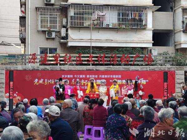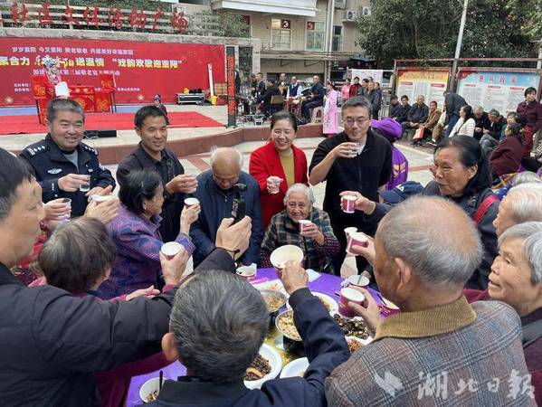 活动伊始,社区党委书记胡志刚代表社区向老人们致以节日问候。他在致辞中表示:“尊老敬老是中华民族的传统美德,更是社区党建工作的重要抓手。我们希望通过这样的活动,让老年朋友感受到党和政府的关怀,也呼吁更多青年力量参与社区服务,共同构建和谐友爱的邻里关系。”在主持人袁泉的介绍声中,鄂州仄韵演艺有限责任公司的演员们登台献艺戏曲《荞麦馍赶寿》。他们以地方特色文化为载体,将长寿安康的美好寓意融入表演,引得老人们连连鼓掌。舞台上戏曲声声,长者们轻哼熟悉的旋律;舞台下,社区工作人员和志愿者陆续将热气腾腾的饭菜整齐摆放在活动广场的16张桌子上,重阳糕、银耳羹、时令蔬菜与特色菜肴琳琅满目,节日的仪式感扑面而来。