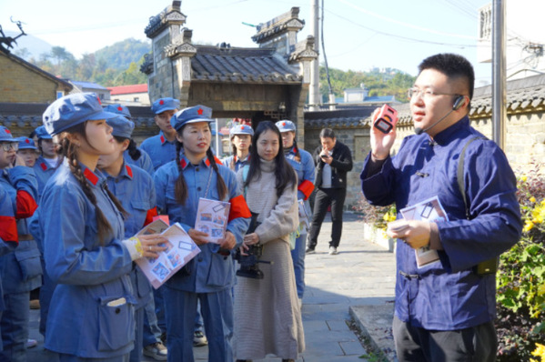活动最后,全体人员前往革命烈士陵园敬献鲜花、默哀致敬。青石板路上,这支特殊的“红军”队伍成为古村一道亮丽的风景。引导员在现场动情讲述隐蔽战线先辈坚守信仰、无畏牺牲的感人事迹,引导同学们深刻感悟革命精神,进一步增强责任意识与历史使命感。