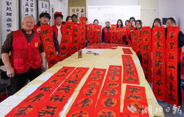 活动最后,两位老师为每位学生精心创作了一副“新春迎元旦”主题对联,寄托着对青年学子新年的美好祝福。当学生们手捧专属对联与老师合影留念时,脸上洋溢着收获的喜悦。社区党委书记胡志刚表示:“这样的活动既传承中华优秀传统文化,又丰富了大学生的精神文化生活,是新时代文明实践中心服务群众、凝聚人心的生动体现。”