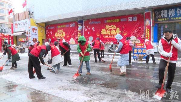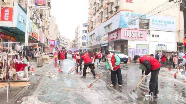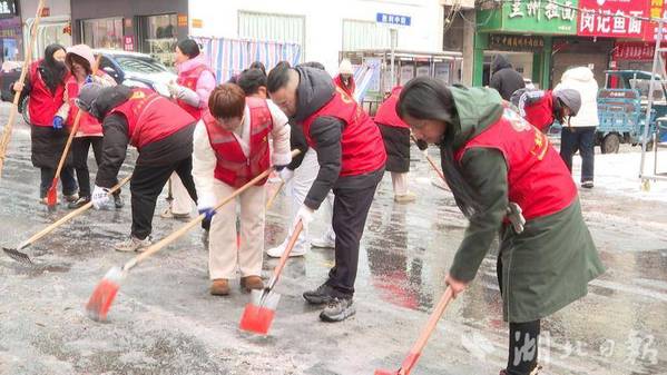 寒风呼啸中,志愿者身着红色马甲穿梭在白雪覆盖的道路上,手持铁锹、扫帚等工具,对结冰路面进行集中破除,逐一清理安全隐患。