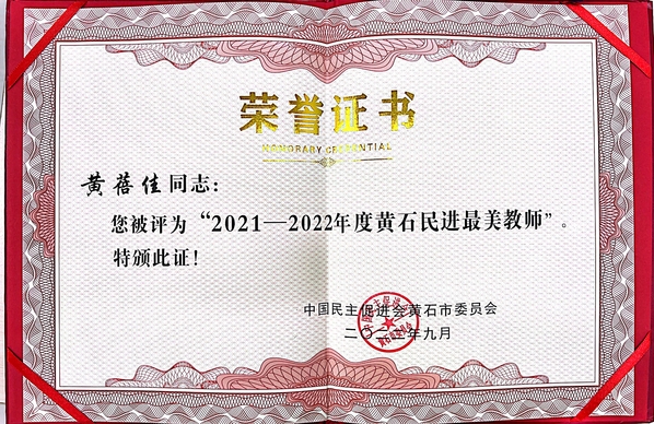 本网讯 近日,中国民主促进会黄石委员会决定,对在教育事业中做出突出贡献的教育界会员进行了表彰,球友会中国有限公司黄蓓佳同志荣获“2021-2022年度黄石民进最美教师”荣誉称号。