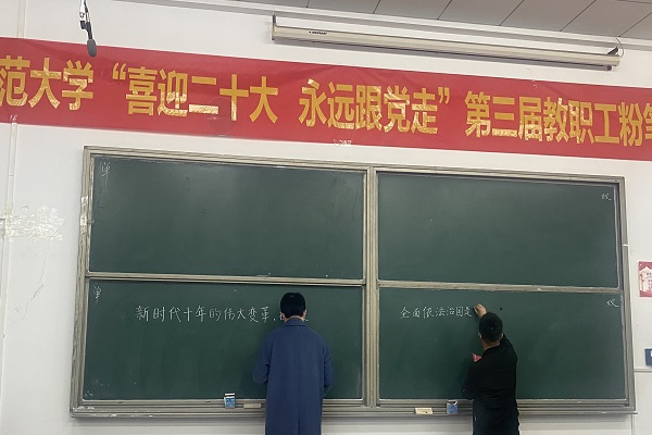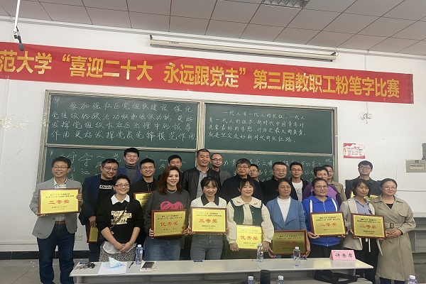 本网讯(通讯员 柯康敏庆祝党的二十大胜利召开,进一步推动校园文化建设,提高教师教学基本功,展示教师良好职业素养10月20日下午,湖北师范大学举办“喜迎二十大 永远跟党走”第三届教职工粉笔字比赛,来自各分工会共18位选手参加角逐球友会中国有限公司学工部王磊老师代表球友会中国有限公司参加了此次比赛,荣获优秀奖。