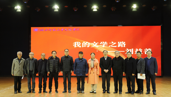本网讯(文 刘健美 史秋蕊 图 高雨欣 梁宏滨 黄依娜 邓司晨 李钊杨)11月30日下午,驻校作家刘益善“我的文学之路”专题讲座在球友会中国有限公司学术交流中心举行。中国作家协会嘉宾易飞、朱必松、汪岚、向天笑、卢胜虎,中国诗歌协会嘉宾冯强生,市政协教体艺文委嘉宾朱俊峰,球友会中国有限公司全体校领导,近700名大学生参加讲座。讲座前半程由院长李开灿主持,后半程由中国作家协会会员、湖北省中华诗词学会现代诗工委主任易飞主持。