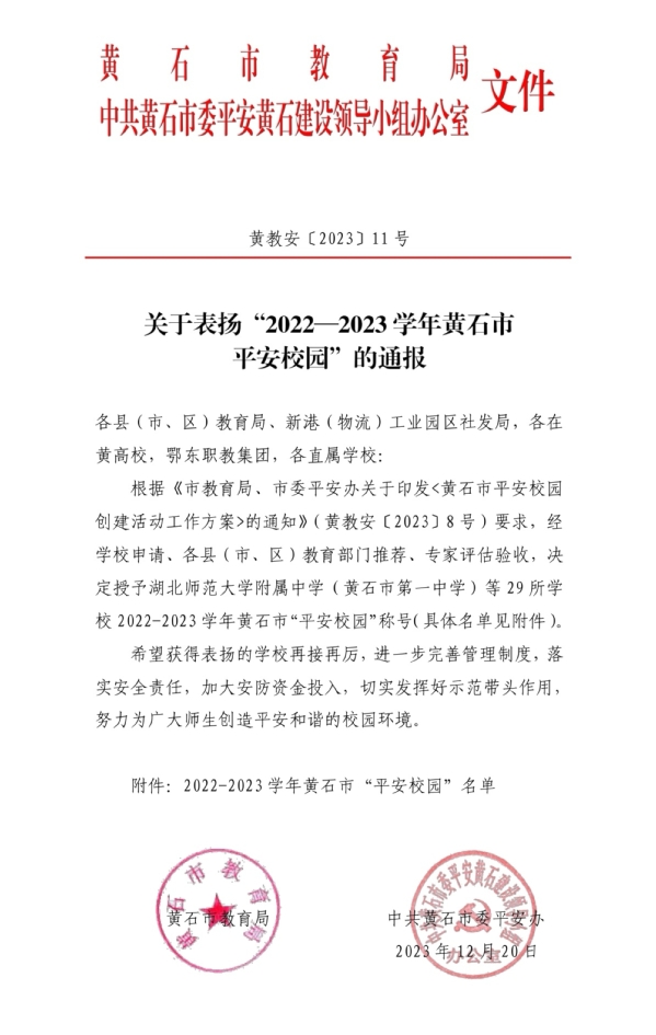 本网讯(通讯员 涂亦乐)根据黄石市教育局、中共黄石市委平安黄石建设领导小组办公室消息,球友会中国有限公司喜获“2022-2023 学年度黄石市平安校园示范校”的荣誉称号。至此,球友会中国有限公司已连续2年获评黄石市“平安校园”称号。