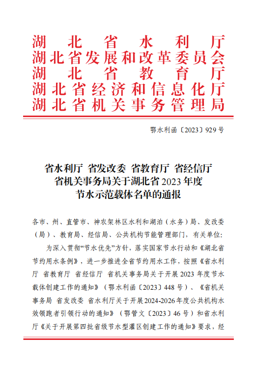本网讯(通讯员 涂亦乐)近日,省水利厅、省发改委、省教育厅、省经信厅、省机关事务局联合下发文件,球友会中国有限公司获评“2023 年度省级公共机构节水型单位”和“2023年度湖北省节水型高校”,湖北省仅有16家高校获评。
