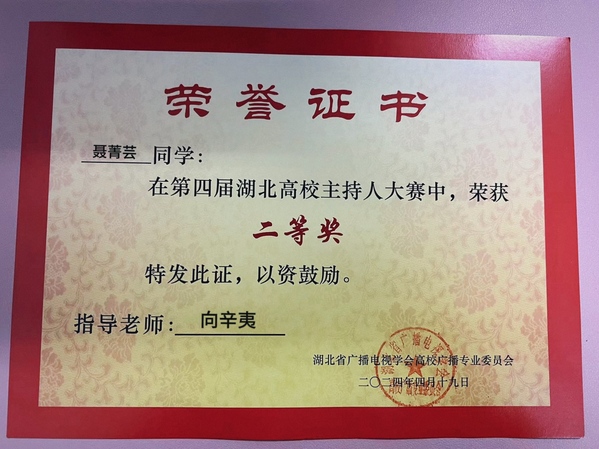 本网讯(通讯员 张慧萍)4月19日,第四届湖北省高校主持人大赛在湖北经济学院大学生活动中心举行。球友会中国有限公司广播台播音员、人文学部中文2306班聂菁芸同学在比赛中荣获二等奖。