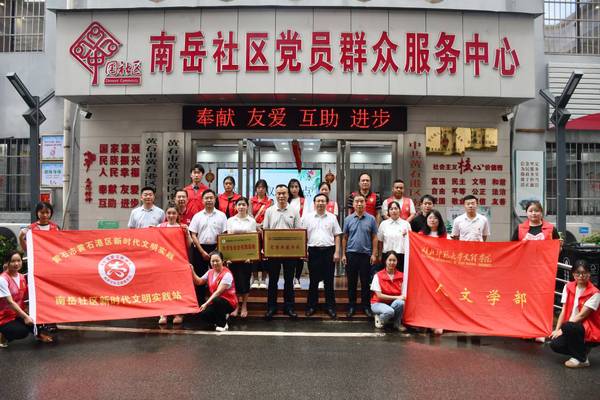 周景斌与喻向东、南岳社区党委副书记徐岚共同为“大学生社会实践基地”授牌。