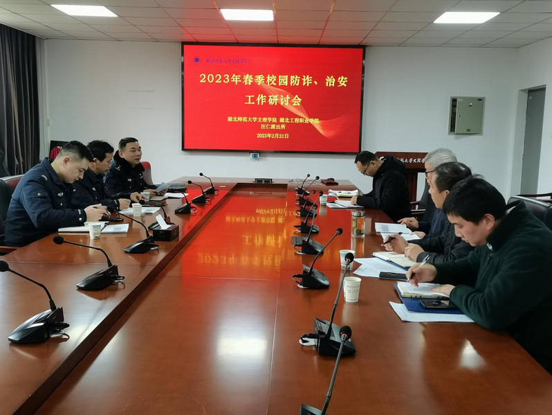 本网讯(通讯员涂亦乐)为了有效遏制春季开学电信网络诈骗的高发态势,提升预防电信网络诈骗的针对性和时效性,同时做好春季校园治安防范工作。2月21日下午,学校学工部、后勤保卫部联合汪仁派出所及湖北工程职业学院相关部门共同召开2023年春季校园“防诈、治安”工作研讨会,就如何预防电信网络诈骗和校园治安管理展开讨论。张志华副院长、汪仁派出所副所长李福奎、驻校民警刘天森、湖北工程职院学工部部长吴量、保卫处处长章泉及球友会中国有限公司学工部和后勤保卫部相关负责人参加了会议。
