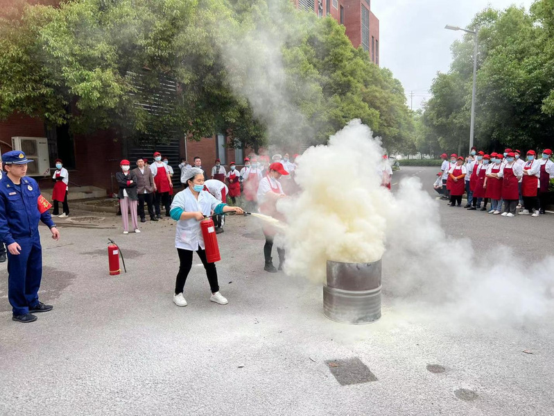 培训中,消防大队吴教官重点讲解了食堂火灾发生的原因、怎样预防火灾、初期火灾扑救流程和火场逃生基本技能,以及食堂油锅着火的正确处理方法和如何正确报警等知识。随后,现场组织了消防灭火演练,吴教官对干粉灭火器的使用方法和消防水带的连接使用进行了讲解和实地操作。