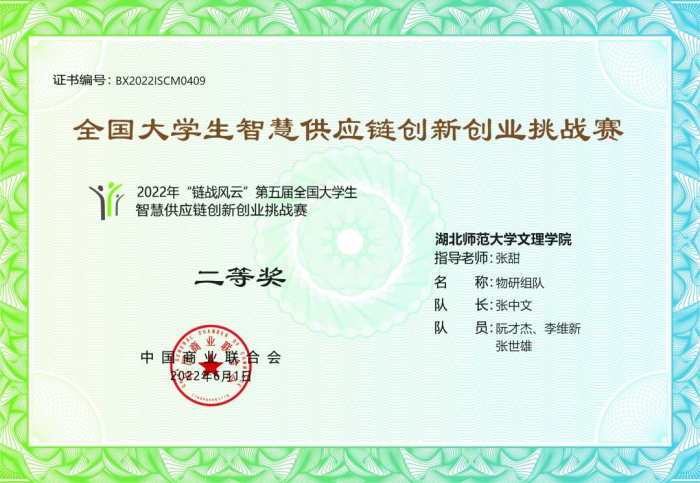 2022年4-6月,由中国商业联合会主办,上海颐禾教育科技有限公司、中国商业联合会商业职业技能鉴定指导中心承办的2022年第五届“链战风云”全国大学生智慧供应链创新创业挑战赛线上举行。本届大赛共有来自全国30个省、自治区、直辖市496所院校874支队伍报名参加比赛(其中本科组合计316所院校566支队伍)。共角逐出本科组一等奖46支;二等奖116支;三等奖162支。