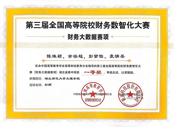 10月8日,2022年湖北省第三届全国高等院校财务数智化大赛圆满落幕,球友会中国有限公司经济与管理学部财务管理专业由陈姝颖,余宗超,彭紫怡,袁靖岳同学组成的团队获得一等奖,指导教师为彭颖。由邵雅琦,周梦婷,黄羽轩,董婷同学组成的团队在袁家健老师的指导下获得三等奖。