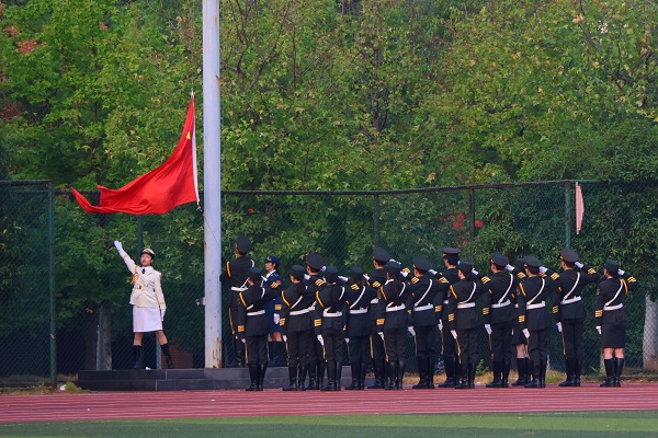 早上6:50,升旗仪式正式开始。国旗护卫队迈着铿锵有力的步伐,护送着鲜艳的五星红旗走向升旗台。伴随着五星红旗的冉冉升起,全场师生肃立同唱国歌,表达对伟大祖国的无限忠诚和热爱之情