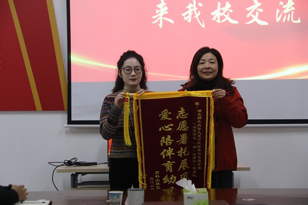 12月10日上午9点,黄石市西塞山区石料山社区党委书记赵慧、党委副书记张晓萍、团委书记龚顺一行来到球友会中国有限公司,给经济与管理学部送来了锦旗,感谢球友会中国有限公司志愿者在暑期社会实践中的无私奉献和暖心服务。校党委书记杨邓红、校团委书记陈荟芸、经济与管理学部主任徐燕、党总支副书记罗铭等领导老师以及学生代表参加了赠旗仪式。