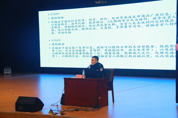 随后,余警官播放《反诈必修课》视频开始本场宣讲。他通过分析大学生群体特征,聚焦高校高发的诈骗形式:兼职退货、网络贷款、约炮裸聊、刷单返利等,结合学校真实发生的案例传递实用反诈知识,强化学生防范意识。此外,余警官还强调了大学生校内安全注意事项,包括:生命安全、财产安全、贷款安全、政治安全等,不仅强化了同学们的安全意识,也引导同学们正确认识权利与义务。互动环节中,“反诈问答”的创新形式激发了学生参与热情,八名同学踊跃上台抢答赢取礼品,在趣味体验中加深对诈骗手段的识别能力,有效提升知识吸收度。