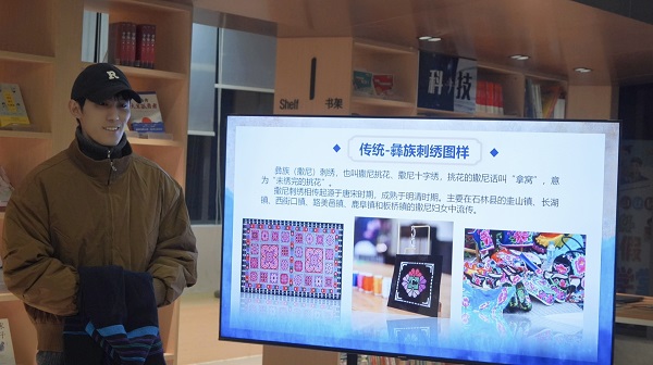 地惹瓦尔同学做“从凉山彝族文创看传统到现代的文化蝶变”主题分享。他现场展示带有羊角纹、蕨菜纹等传统元素的彝族手绣服装,并结合所学专业知识,解析彝族文化通过流行音乐、电影等载体走向大众的经济文化逻辑,分享索玛花图腾文创周边、彝族高定饰品品牌等案例,展现民族文化交融赋能产业发展的鲜活实践,传递出铸牢中华民族共同体意识的时代内涵。