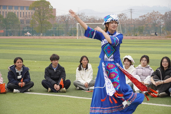 接下来,民族服饰与习俗分享环节三位少数民族同学依次登台分享,有力地传递各民族相亲相爱、情感共鸣的动人力量。互联网金融2302班彝族同学地惹瓦尔首先登场,讲解了彝族服饰的文化内涵与“火把节”的由来电子商务2401班壮族同学樊秋玲现场教学壮族语言;经济学2401班土家族同学冉佳丽展示了“摆手舞”。