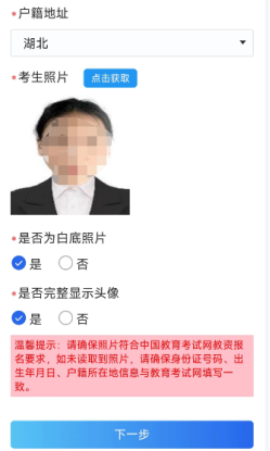5.选择出生日期和户籍,然后“点击获取”检查考生照片。(请务必确保出生日期和户籍选择和中国教育考试网填写一致,请仔细核对保存一致。)