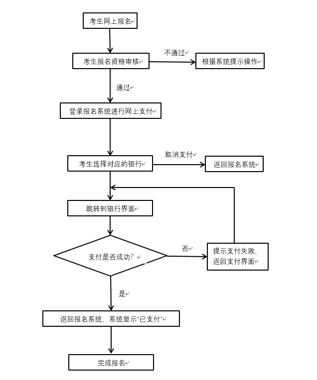 登录→注册→网上报名→扫码上传资料→ 等待审核→ 审核通过→网上缴费。