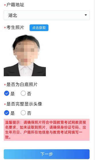 5.选择出生日期和户籍,然后“点击获取”检查考生照片。(请务必确保出生日期和户籍选择和中国教育考试网填写一致,请仔细核对保存一致)