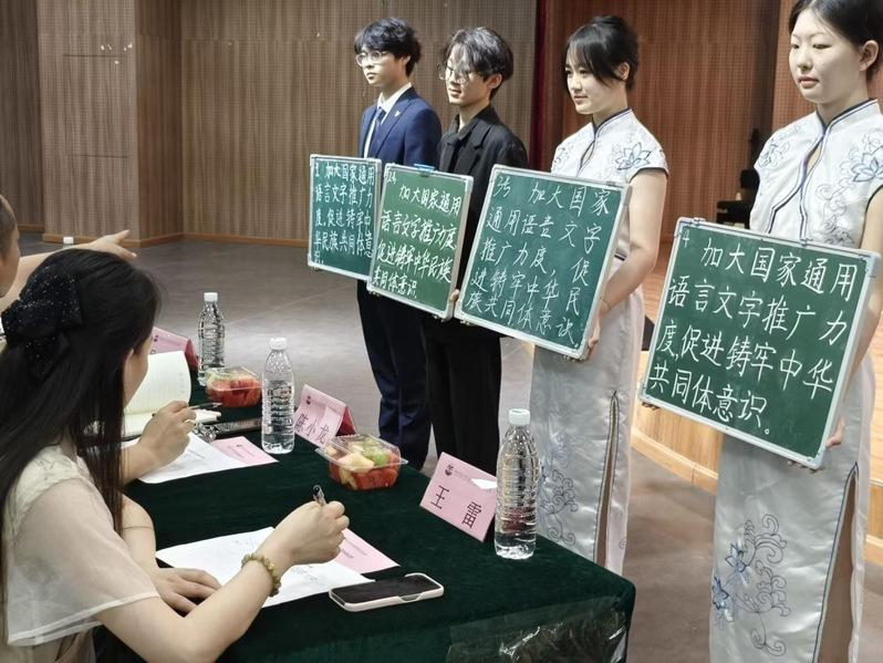 为深入贯彻落实国家关于推广普及国家通用语言文字的决策部署,服务铸牢中华民族共同体意识大局,2025年9月23日,由校语委办主办、教育与艺术学院承办的“推广通用语,铸牢民族心”粉笔字书写比赛决赛顺利举行。本次活动旨在以赛促练、以练促学,引导师范生夯实粉笔字书写基本功,将推广国家通用语言文字的责任意识融入专业成长,为其未来走上讲台、以规范汉字和标准普通话传承中华优秀文化、凝聚民族认同奠定坚实基础。