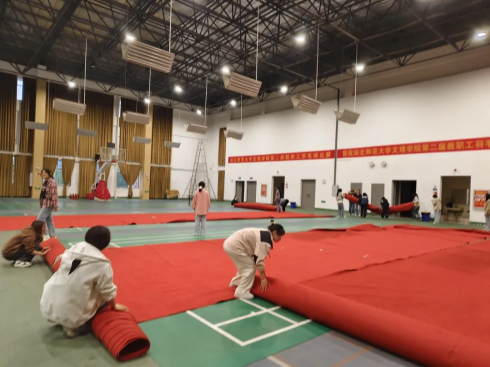 同时,理工学部学生党员们以责任感和奉献精神展现了共产党员的先锋本色。3月26日,理工学部学生党支部的志愿者们早早到达现场,投入紧张的准备工作。他们打扫会场、布置展位、摆放企业展板,确保招聘会前期的各项准备工作有序进行。3月27日招聘会结束后,学生党支部的志愿者们积极打扫卫生,撤去企业展板、桌椅地毯等,将风雨操场恢复原貌,供广大爱好运动的文理学子们继续使用。