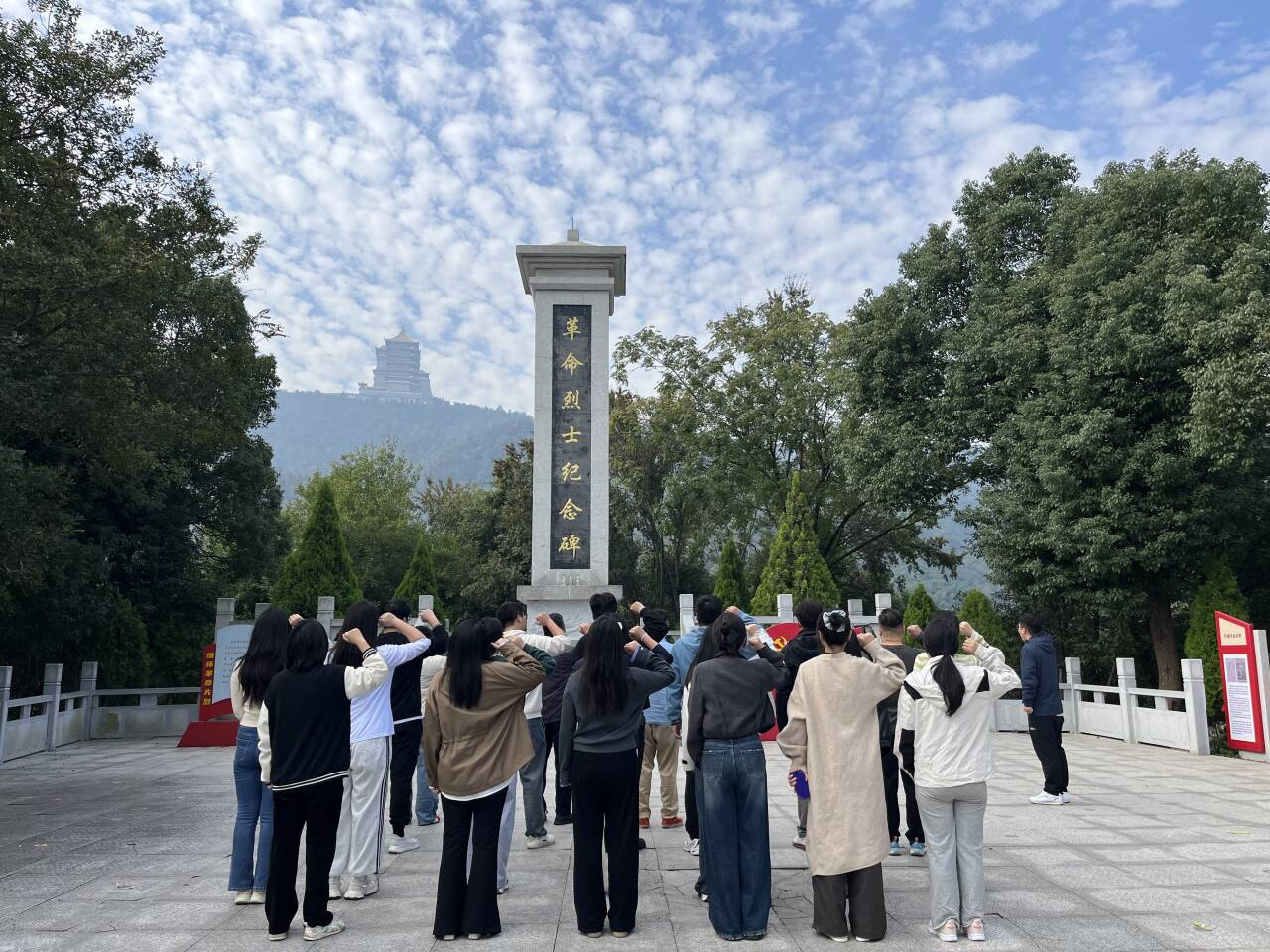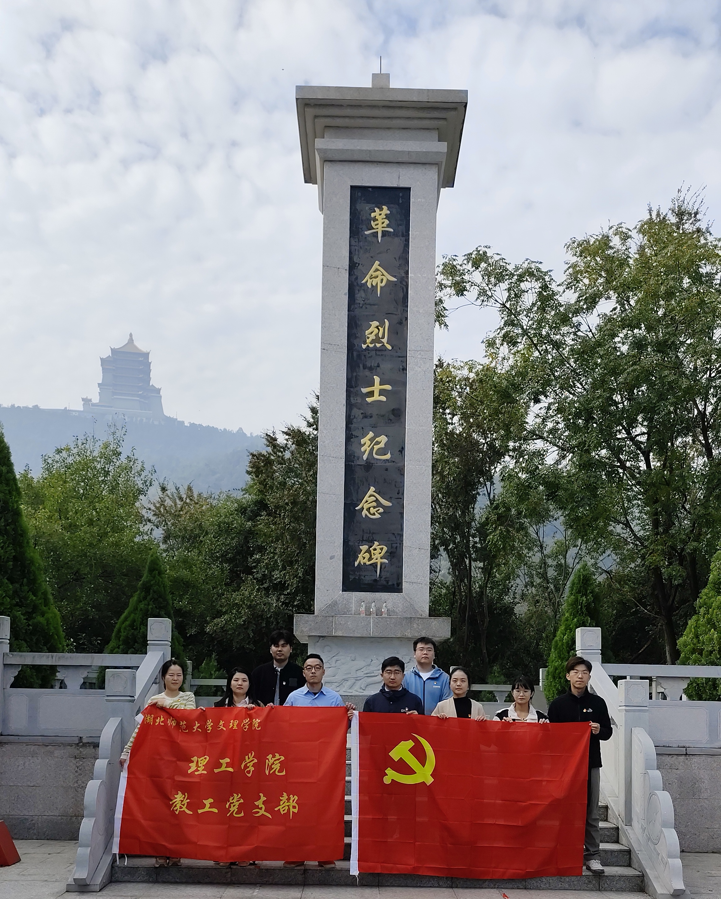 步行至山顶后,在巍峨的革命烈士纪念碑前,全体党员列队肃立,举行庄严的缅怀仪式。大家向革命先烈深深三鞠躬。随后,在理工学院教工党支部书记黎博的领誓下,面对鲜红党旗,重温入党誓词。铿锵誓言,回荡山林,彰显了党员们不忘初心、牢记使命的坚定信念。