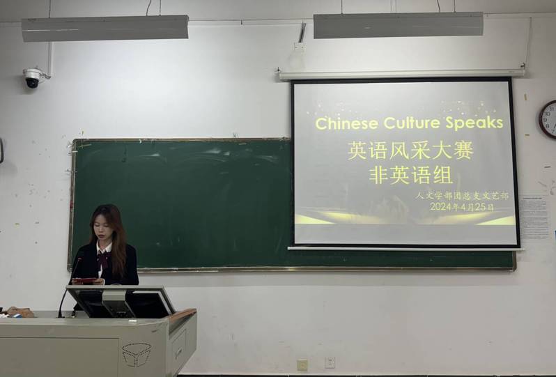 英语作桥梁,文化传世界。为丰富校园文化生活,创设良好的英语活动氛围,提升同学们对英语学习的兴趣,给学生提供展示个性、发挥特长、展现英语风采的平台,人文学部于4月25日晚在教学楼1A201、1A203举办以“Chinese Culture Speaks”为主题的英语风采大赛。此次活动旨在激发大学生对祖国、对中华传统文化的热爱之情,提升学生的文化自信,传递中国文化正能量。