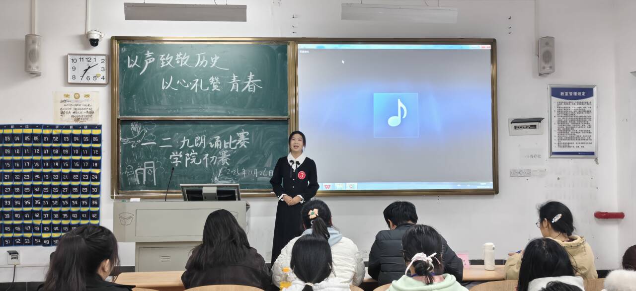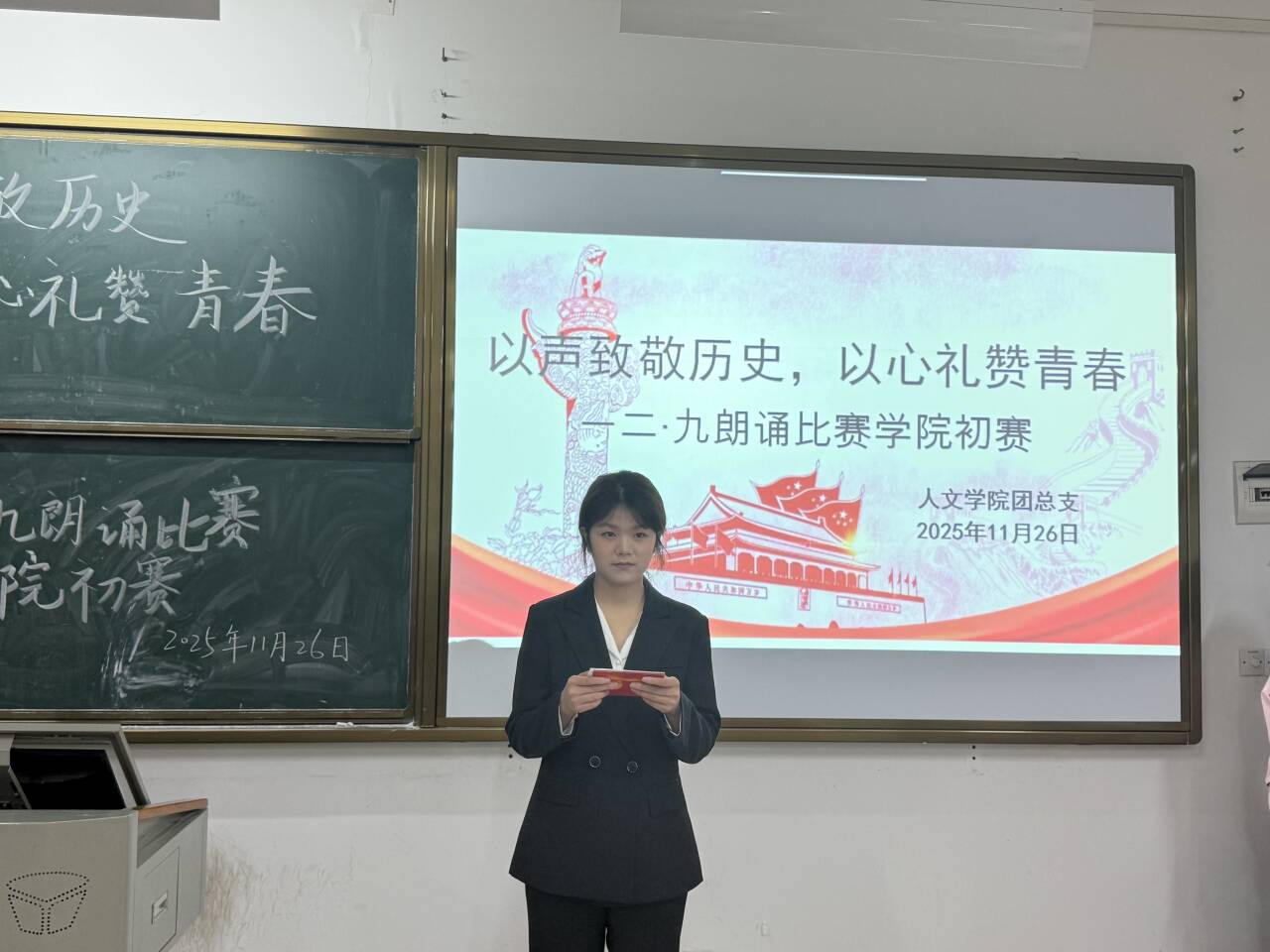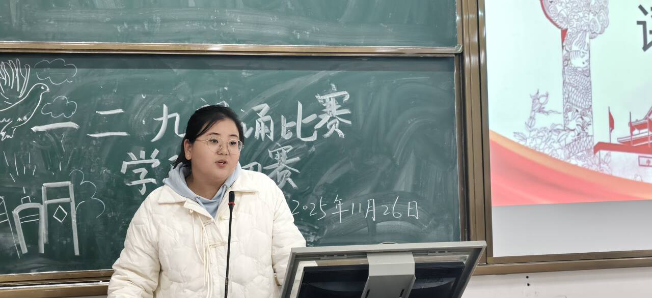 为纪念“一二·九”爱国学生运动,激发青年学子厚植家国情怀,传承红色基因,2025年11月26日晚19时,人文学院于1B209教室成功举办“以声致敬历史 以心礼赞青春”主题朗诵比赛初赛。活动旨在通过诵读经典,引导学生深刻理解“一二·九”运动蕴含的民族记忆与精神内涵,凝聚青春力量,共筑中国梦。