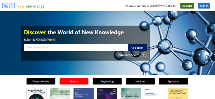 “新知学术发现系统”(https://scholar.newacademic.net)集成了学术期刊、会议论文、学位论文、专利、图书等海量中外文学术资源,超过30万全球重点期刊,超过80万个学术数据库和站点,可为老师们提供专业全面的资源检索。(使用方法:校园IP内登录)