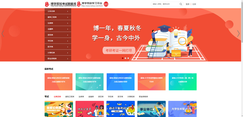 《博学易知公考数据库》平台以在线考试管理系统和教学资源库系统为基础,结合高质量的系列精品公务员考试职业培训课程,并提供历年公务员真题、模拟题等系列资源,为全国各地公务员考试人员及事业单位从业者提供公务员考试系统化辅导课程的多媒体数据库,辅助学员全面提升行政职业能力、表达能力、协调能力等,通过公务员考试成为一名合格的公务人员,为国家发展贡献自己的力量。平台课程包含行政职业能力、申论、面试等全程体系化课程,课程内容涉及导学、基础、习题、冲刺、专题等。视频课程贴近考试实际,涵盖大纲全部知识点,是提高考生各项考试知识技能、有效学习、快速通过考试的重要法宝。