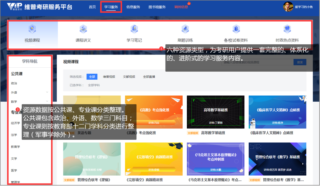 产品全新打造的“学习服务”版块,集成原考研库包含的复习备考所需资源类型,新增了“时政热点资料”模块,支持用户通过“时政新闻、时政试题”积累时政常识;整合了原“试题库、试卷库”并构建成新的“刷题训练”模块,用户点击“做题”“开始考试”即可跳转至“维普考试服务平台7.0”获取更加全面有效的刷题练习服务。“学习服务”包含的视频课程、课程讲义、学习笔记、刷题训练、各校试卷资料及时政热点资料六种资源类型,为考研人群提供了一个进阶式的、体系化的学习服务,帮助用户进行系统连贯的高效复习。