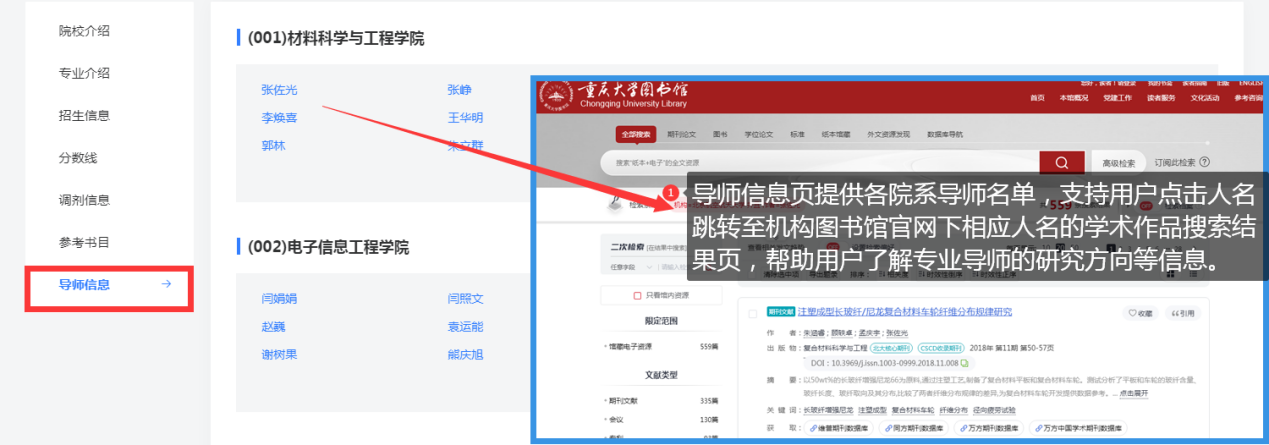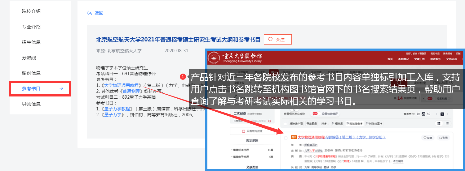 产品利用了维普的数据收集、数据整理、数据集成优势,通过维普考研服务平台与维普智慧图书馆知识库融合联动,为考研用户提供“信息服务”版块下“参考书目、专业文献、导师作品”的考研关联知识服务,支持用户点击相应栏目的链接跳转至图书馆知识库下的内容页面,拓展知识可以帮助用户查询了解有助于考研考试的学习书目,了解报考专业的未来发展趋势,了解专业导师的学术研究方向及学术成果等。