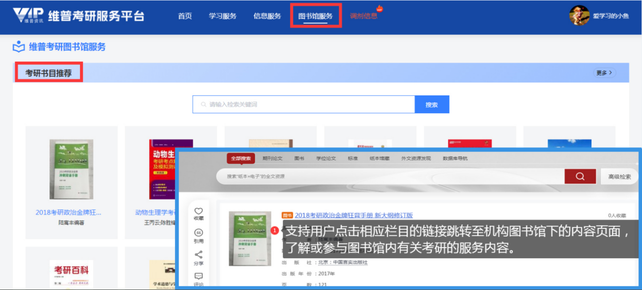 平台提供“图书馆服务”应用,以服务考研人群为终极目标,通过与维普智慧图书馆产品融合联动,帮助考研用户通过机构图书馆,获取到馆内针对考研用户提供的专属支撑服务,内容包括“考研书目推荐、考研活动、考研推荐”,支持用户点击相应栏目的链接跳转至机构图书馆下的内容页面,了解或参与图书馆内有关考研的服务内容。