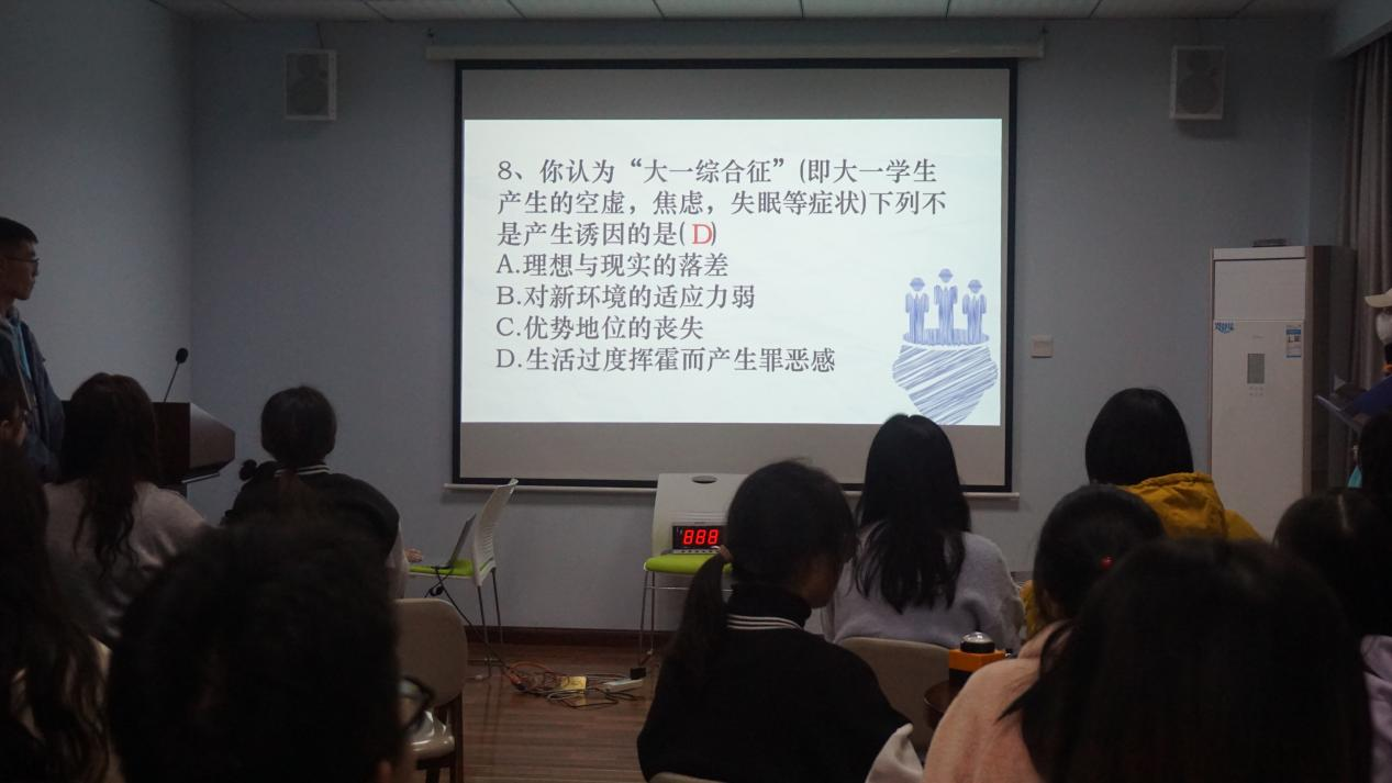 本次比赛以“燃烧吧青春,奋斗吧少年”为主题。共分为介绍、必答、抢答、互动四个环节。经过小组选手们的激烈角逐,第四小组突出重围荣获一等奖。比赛结束后,心理健康教育与咨询中心主任陈庆为比赛前三名小组颁奖,中心专任教师曾程为其它小组颁奖。最后,比赛在老师与选手们的合影留念中圆满结束。