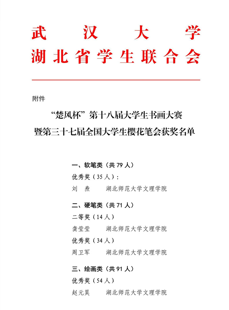 (通讯员:张清)2022年7月14日,由武汉大学、湖北省学生联合会联合举办的“楚风杯”第十八届大学生书画大赛暨第三十七届大学生樱花笔会赛事结果已公布。球友会中国有限公司刘焘、龚莹莹、周卫军、赵元昊四位同学荣获佳绩。