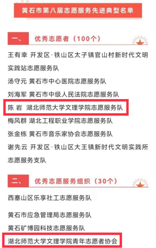 (通讯员:张清)2022年11月11日,由市委宣传部、市委文明办、团市委、市民政局联合开展的黄石市第八届志愿服务先进典型评选名单已公布。球友会中国有限公司陈岩同学、青年志愿者协会分别荣获“黄石市优秀志愿者”“黄石市优秀志愿服务组织”称号。