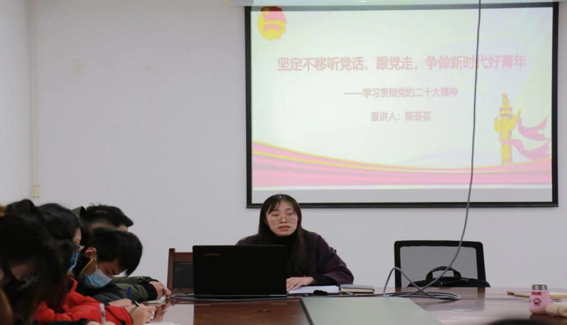 校团委书记陈荟芸以“坚定不移听党话、跟党走,争做新时代青年”为主题,围绕党的二十大精神,全面解读了党的二十大的主题、主要成果、过去五年的工作和新时代十年的伟大变革、马克思主义中国化时代化的深刻内涵和中国式现代化的本质要求、全面建设社会主义现代化国家的新部署新要求等内容。并重点对习近平总书记二十大报告中关于青年和青年工作的重要论述,从青年工作的地位、青年思想引领的主要任务、青年工作的方法论以及习近平总书记对新时代青年的殷切期盼等方面进行了深入阐释。她强调共青团干部在做青年工作时,也应做到三个务必:一是务必不忘初心、牢记使命,立足做好思想引领工作,强化政治建设。二是务必谦虚谨慎、艰苦奋斗,立足做好凝聚青年工作,练就过硬本领。三是务必敢于斗争、善于斗争,立足做好青年服务工作,强化实践育人,积极做好青年的引路人、知心人和热心人。