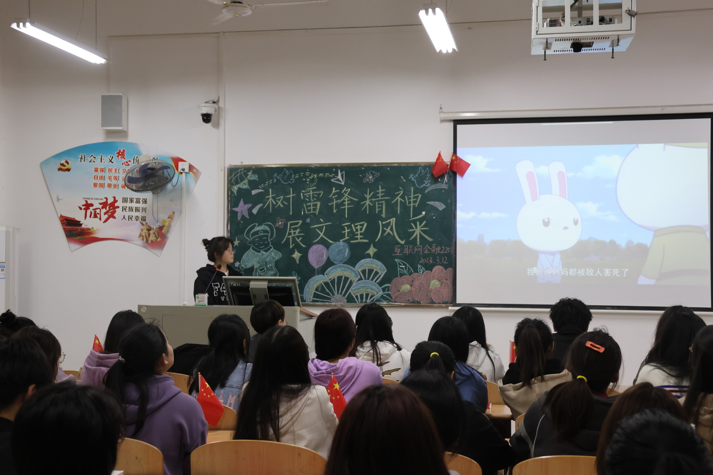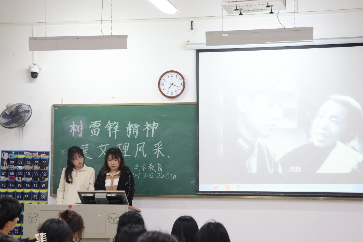 各班主持人通过播放相关视频、朗诵诗歌等形式,带领同学们学习雷锋精神内涵和意义,引导同学们坚定理想信念,将理论与现实相结合,把雷锋精神贯彻到生活的每一方面,为民族复兴的中国梦注入青春力量。